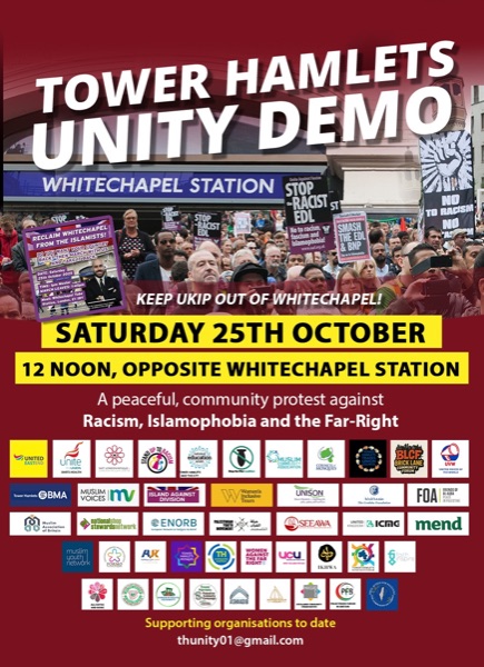 On 25 October StW will be supporting the Unity Demo Against the Far-Right and Islamophobia in Tower Hamlets, London. We will be gathering at 12 noon opposite Whitechapel Station. Please share widely and, if you can, join on the day.