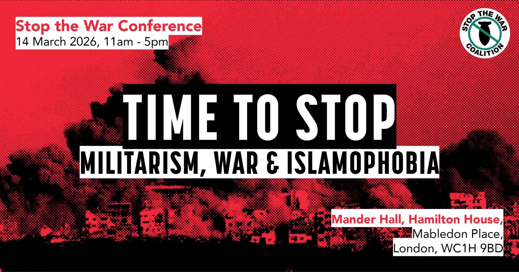 Our annual conference in London on 14 March, headlined Time to Stop Militarism, War and Islamophobia, brings together key figures in the movement and experts to assess this alarming situation and discuss how to respond. As well as plenary discussions there will be workshops on key issues and flashpoints.