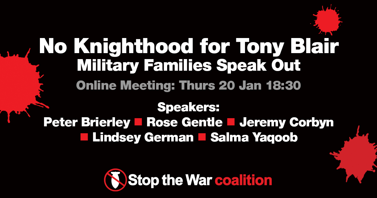 For this online meeting we’re joined by Peter Brierley and Rose Gentle, who lost their children on the battlefields they were sent to by Blair. As they have done for many years, they continue speak out against his wars and want to express their disgust at him being awarded the Order of the Garter.