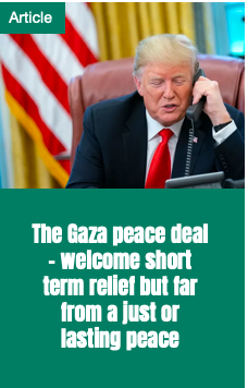 We welcome the end to the bombardment of Gaza, but whilst a ceasefire is a huge relief, this ceasefire deal and the plan on which it is based is tenuous and gives the Palestinians in Gaza no agency over their future.
