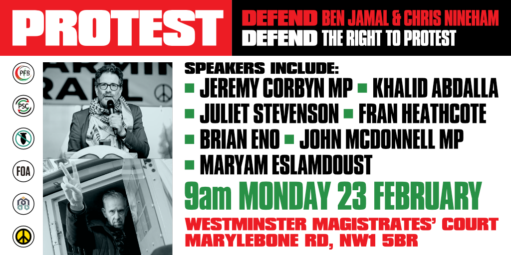 Monday (23 February) is the first day of the trial of Chris Nineham (StWC) and Ben Jamal (PSC), charged for peacefully protesting against genocide last January. Join Jeremy Corbyn MP, John McDonnell MP, Brian Eno, Khalid Abdalla, Juliet Stevenson, Fran Heathcote PCS, Maryam Eslamdoust TSSA outside Westminster Magistrates court at 9am to offer solidarity and demand the charges are dropped.
